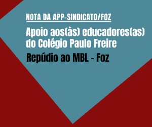 NOTA DE APOIO AOS(ÁS) TRABALHADORES(AS) EM EDUCAÇÃO DO COLÉGIO PAULO FREIRE E REPÚDIO AO MBL- FOZ DO IGUAÇU A direção regional da APP-Sindicato/Foz manifesta todo